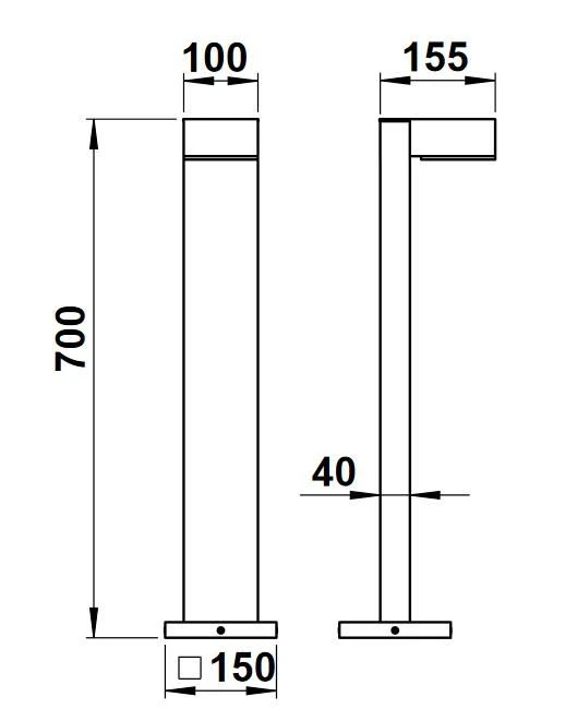 Abmessungen: Höhe: 700 mm, Leuchtfläche Ø100 mm, Länge: 155 mm