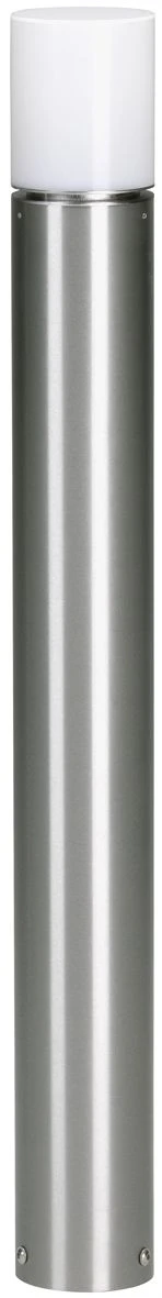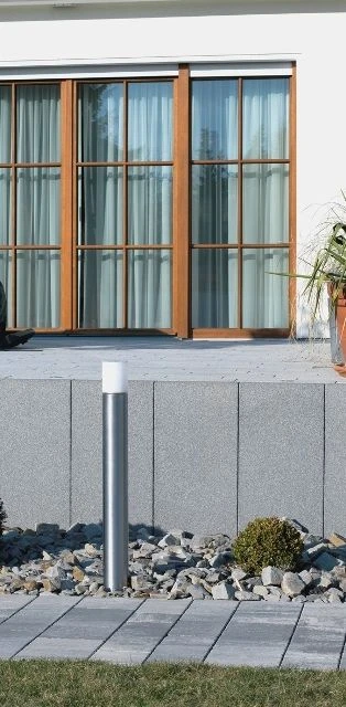 Moderne Edelstahl-Pollerleuchte für Terrasse und Garten mit E27 Fassung.