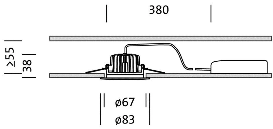 Lunis® 40 IP65, LED, EVG, PMMA, direkt strahlend, 100°, Einzelanordnung, Einbau in der Decke ø= 67mm, Phasenan- oder -abschnittdimmung