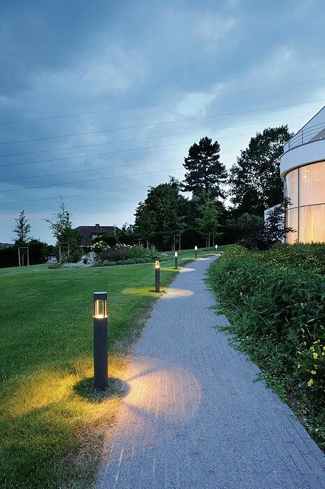 Das LED-Modul ist in das Kopfteil der Wegeleuchte integriert und strahlt nach unten, so dass eine Blendung wirksam reduziert wird